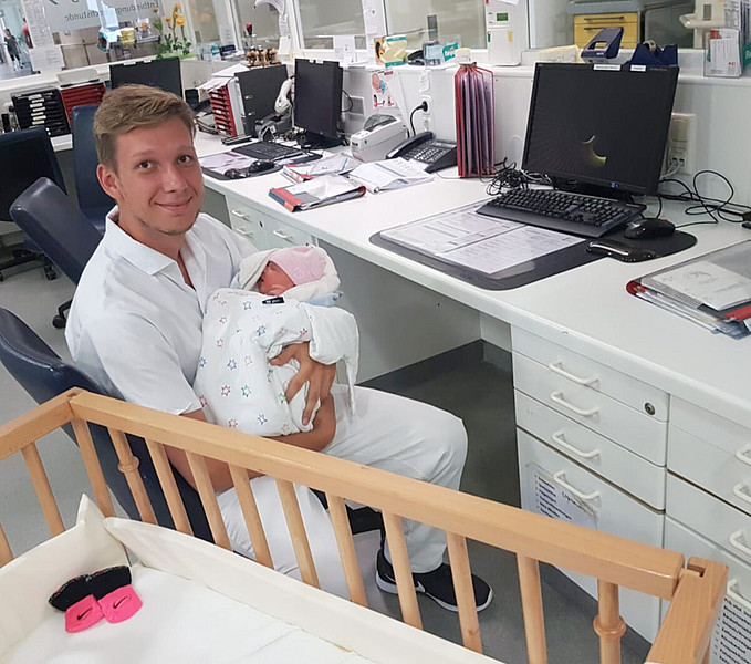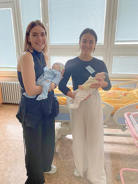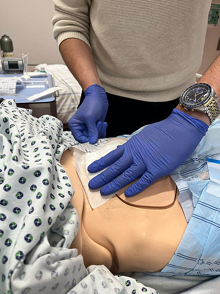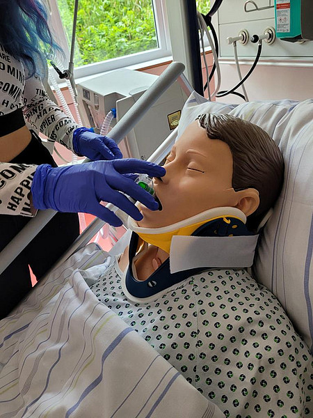 Neben den Übungsräumen haben wir auch ein sogenanntes Skills Lab: In diesen Räumen üben unsere Schülerinnen und Schüler an lebensechten Simulationspuppen, während eine Lehrkraft im Nebenraum die Situation dank Spiegelfenster und Kamera "unsichtbar" beobachten kann. Durch ein Mikrofon kann die Lehrkraft den Schüler:innen Anweisungen und Feedback geben oder die "Patienten" sprechen lassen.