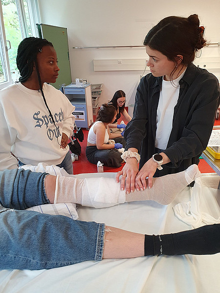 Blutdruck messen, den Puls fühlen, Wunden säubern, Verbände wechseln oder auch einfach mit Patientenfragen und -reaktionen umgehen: All das üben wir gemeinsam in einem lebensechten Setting mit unseren Simulationspuppen.