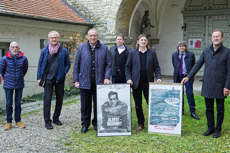 Bild: Bezirkstagspräsident Franz Löffler (3.v.li.) und medbo Vorstand Dr. Dr. Helmut Hausner (2.v.re.) bedanken sich bei Regisseur Josef Rödl (3.v.re.) für die Sachspende. Der medbo Kurator Bruno Feldmann (li.) hat schon erste Ideen, wie die Werke im medbo Psychiatriemuseum inszeniert werden könnten. Auch Bezirksrat Richard Gaßner (re.) und Bezirksheimatpfleger Dr. Tobias Appl (Mitte) finden: Die neuen Exponate sind eine wertvolle Bereicherung des Museumsbestandes. Der Kontakt zwischen Rödl und der medbo entstand über den Mitarbeiter im Ruhestand Bruno Lehmeier (2.v.li.).